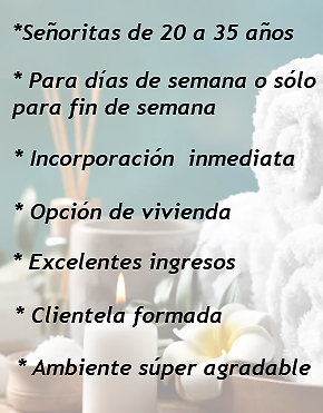 📍EN ZONA TERMINAL, SPA PARA CABALLEROS BUSCA SEÑORITAS INDEPENDIENTES CON MAYORIA DE EDAD EN ADELANTE, DE BUENA PRESENCIA Y AMABLES //✨ INCORPORACIÓN INMEDIATA, GANANCIA RÁPIDA, AMBIENTE SÚPER AGRADABLE, HORARIO FLEXIBLE, OPCION DE VIVIENDA, CLIENTELA FORMADA. // ✨PARA MÁS INFO ESCRIBINOS AL WHATSAPP. MUCHAS GRACIAS!